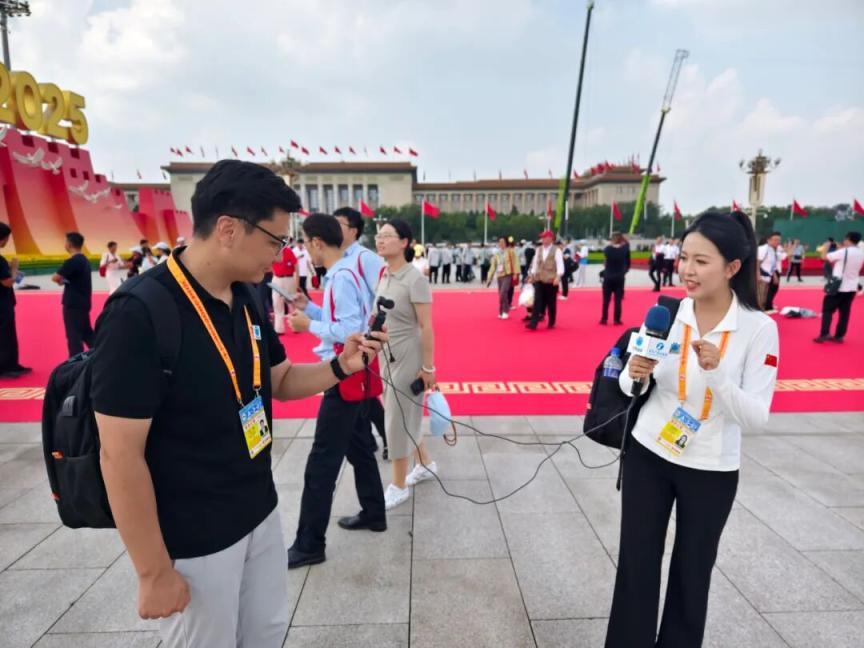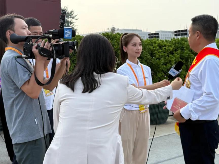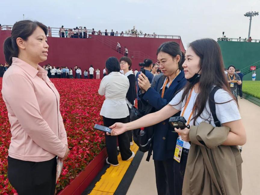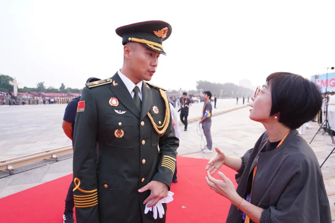浙江卫视记者陈沫(右二)在天安门东侧观礼台采访受邀观礼的“时代楷模”。