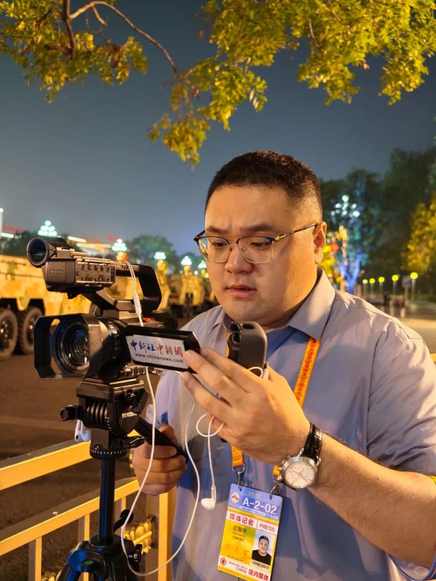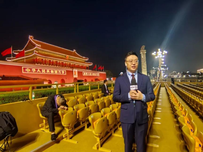 中央广播电视总台新闻中心记者刘峰在观礼台准备直播连线。