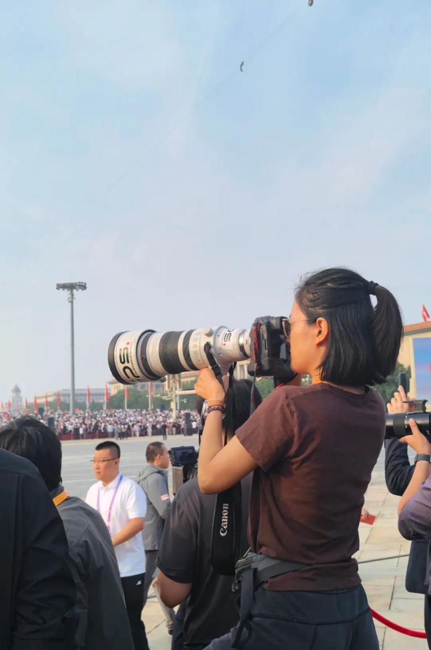 中国青年报记者曲俊燕在天安门广场拍摄报道。