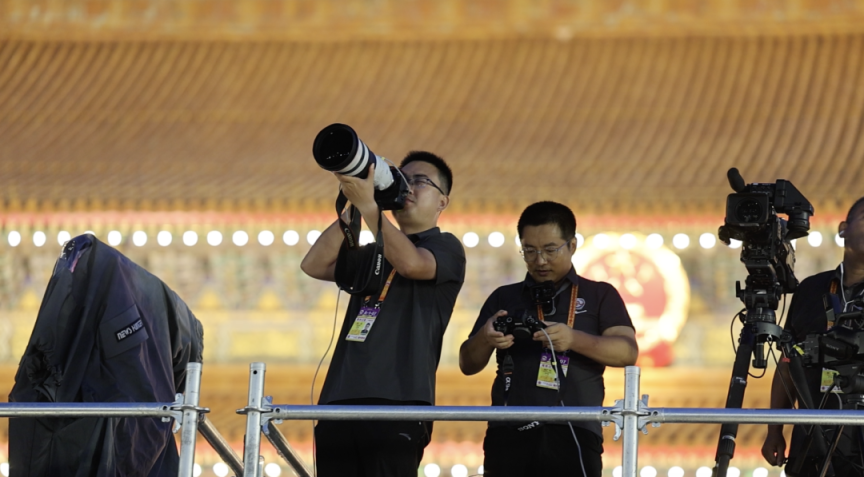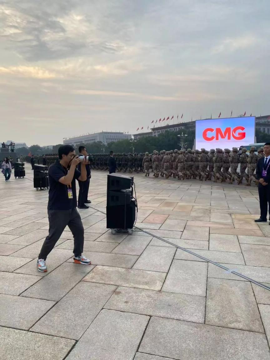 楚天都市报·极目新闻记者刘博在天安门广场西侧临时观礼台准备拍摄。