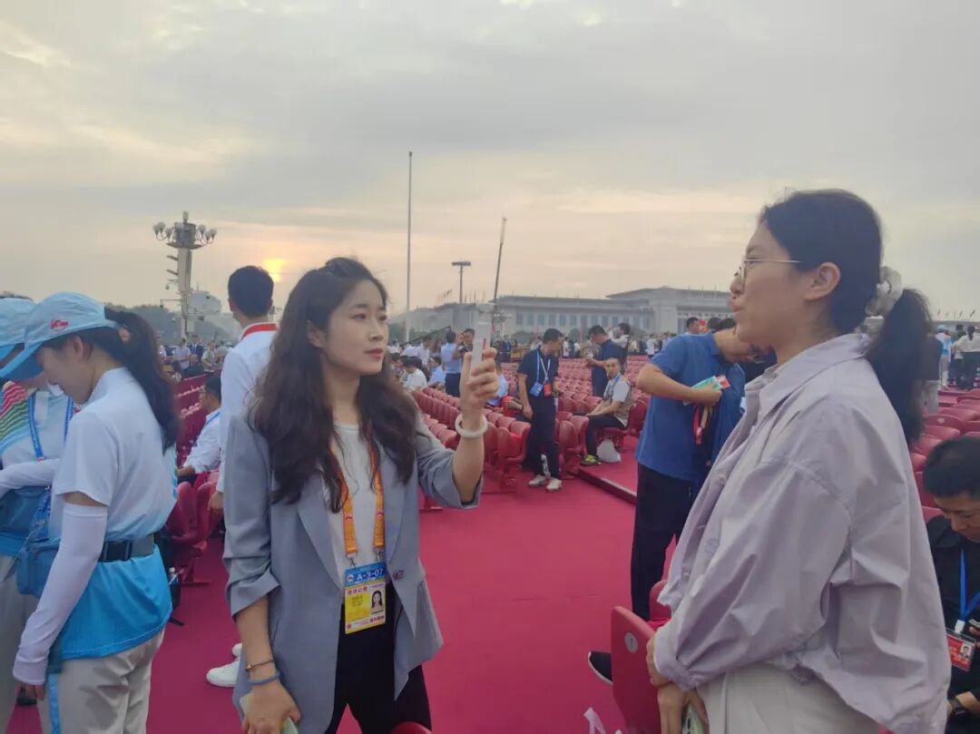 中国妇女报记者肖睿、宿琳在天安门广场采访观礼观众。