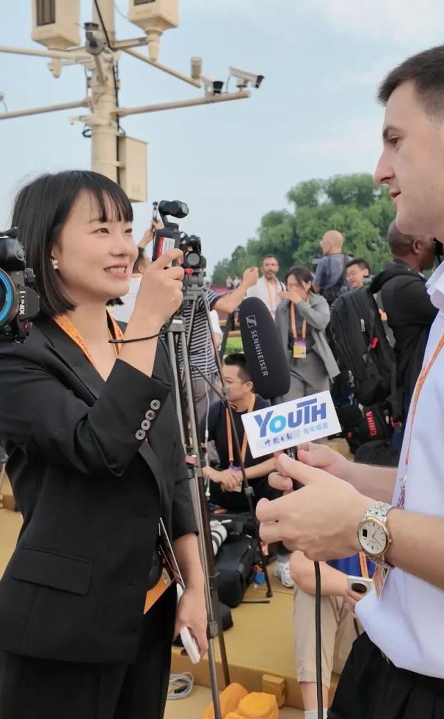 光明日报全媒体记者姜奕名在采访外国记者。