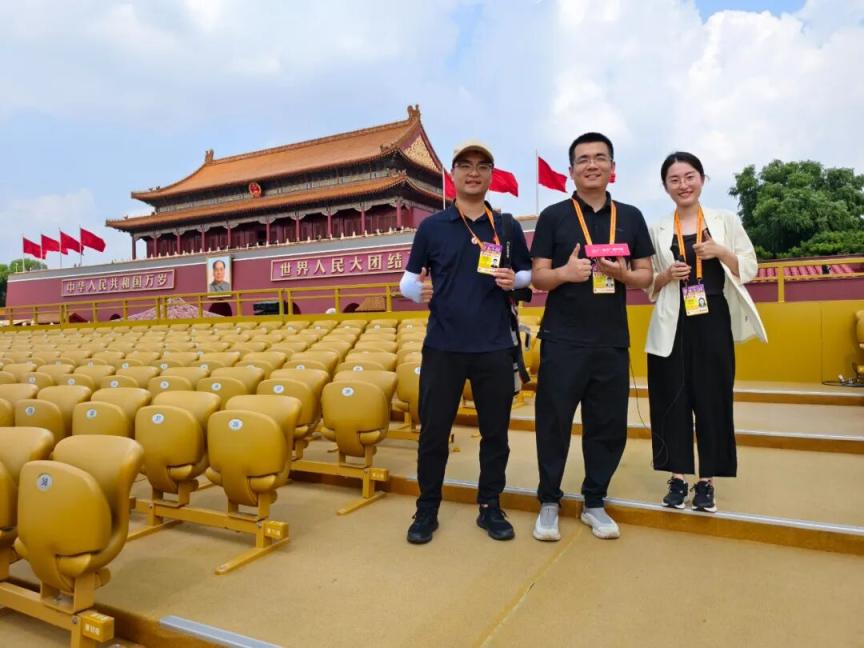南方日报、南方+记者张梓望、祁雷、吴彬彬完成现场采访任务后,在天安门城楼前愉快地合影。