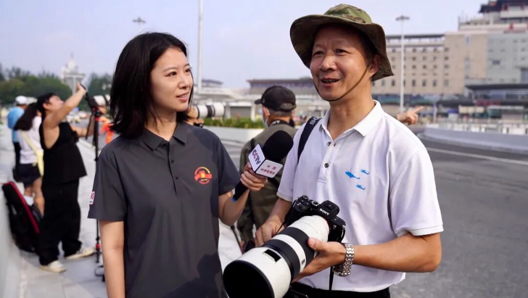中央广播电视总台新闻中心记者张丛婧在长安街沿线采访摄影爱好者。