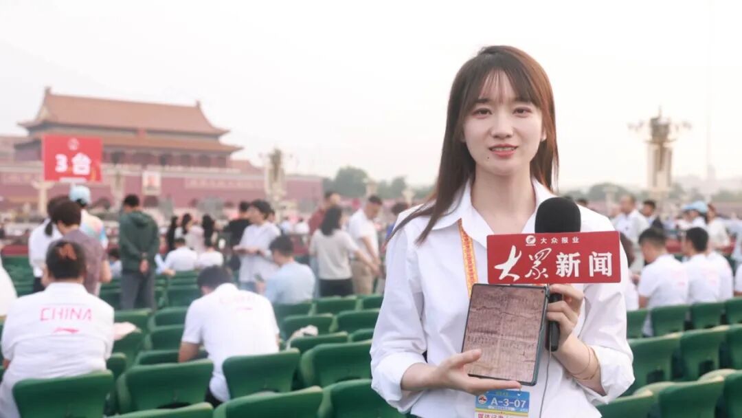 科技日报记者何沛苁在天安门广场临时观礼台采访。