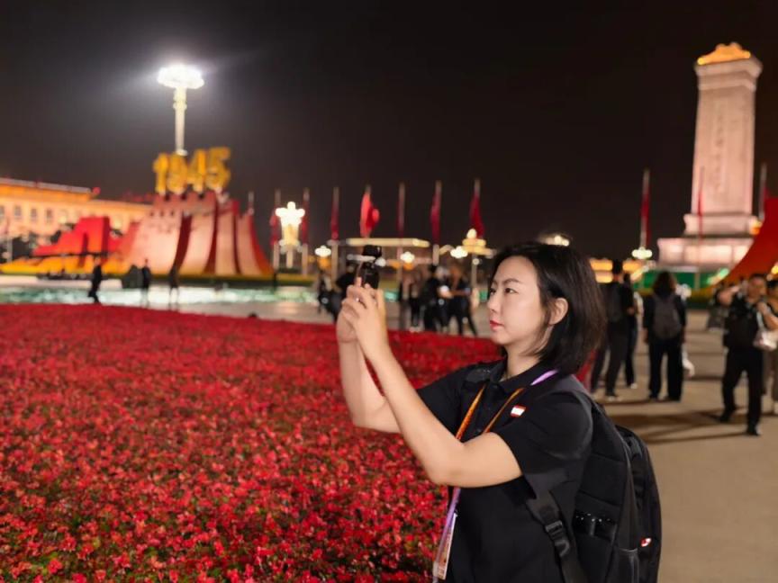 阅兵开始前,人民日报记者陈圆圆在天安门广场上拍摄Vlog。